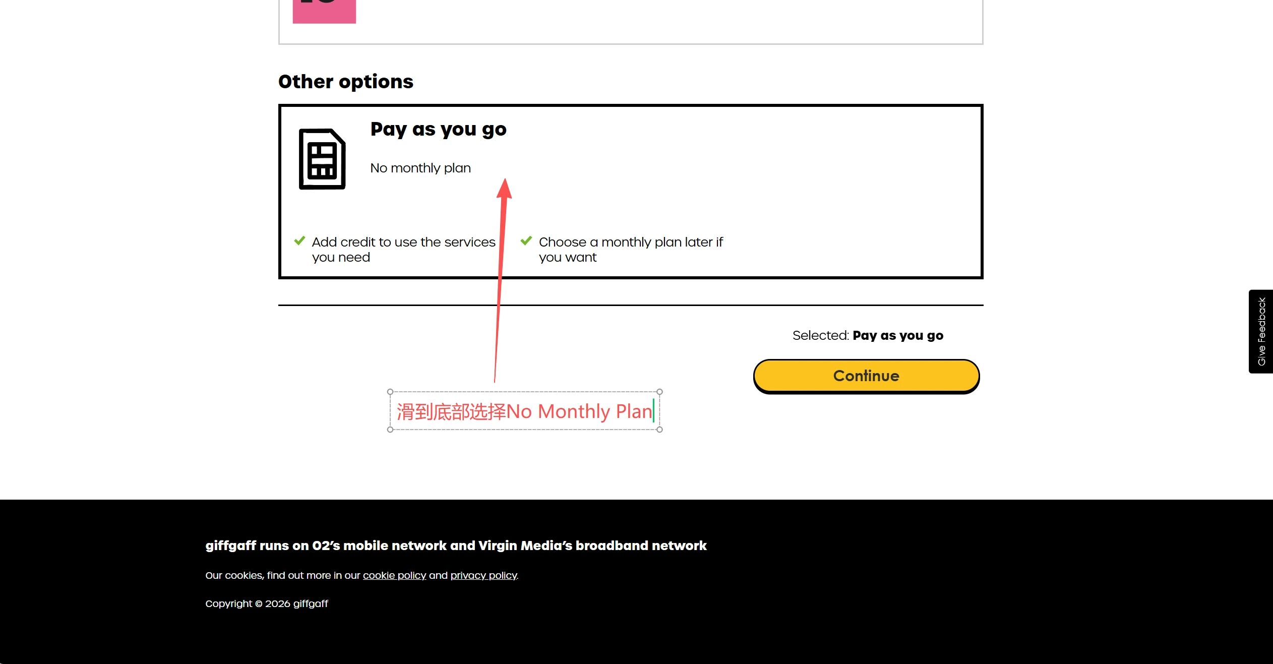 请滑到页面最下方,选择 “Pay as you go”(0 月租模式),不要选带颜色背景的套餐。